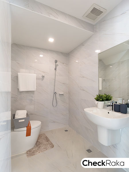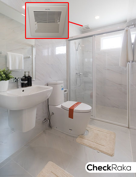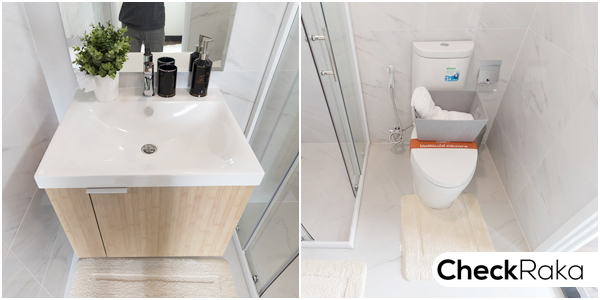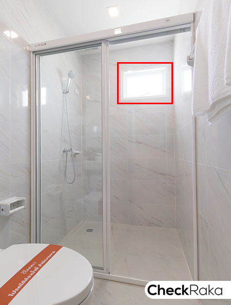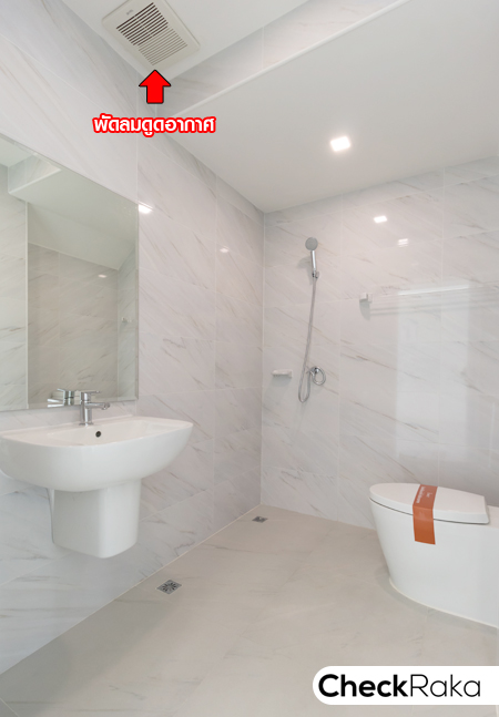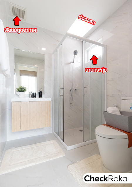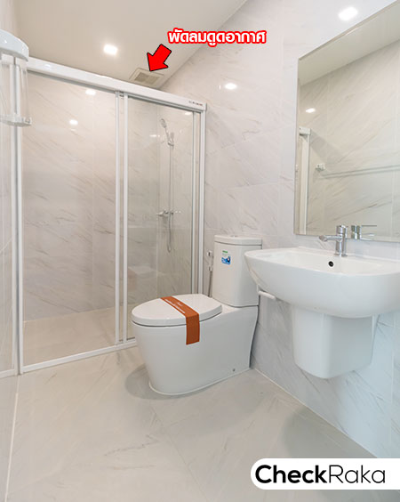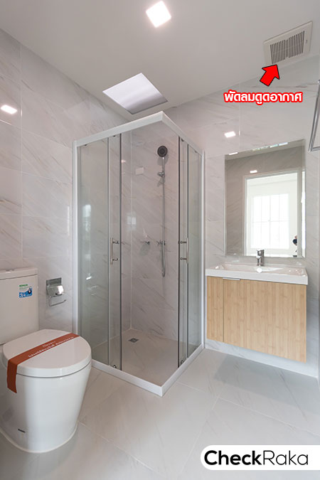 ห้องน้ำในตัวให้สุขภัณฑ์ครบ แยกส่วนเปียก/แห้งให้ด้วย Shower Box ติดตั้งพัดลมดูดอากาศ