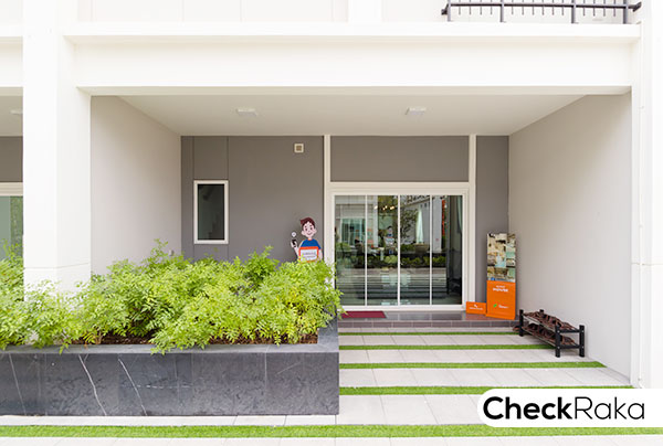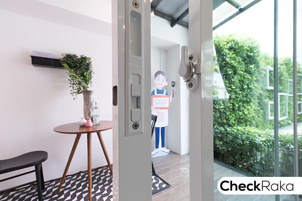 ไฟด้านหน้าเป็นโคมไฟ LED ประตูทางเข้าหลักเป็นประตูบานเลื่อนพร้อมตัวล็อค 2 ชั้น ข้างประตูฝั่งขวามือเป็นหน้าต่าง