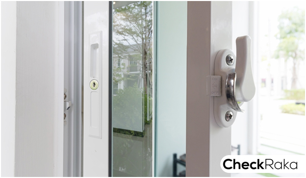 สำหรับประตูบานเลื่อนด้านหน้าเป็นบานเลื่อนเดี่ยว พร้อมตัวล็อค 2 ชั้น กรอบ/วงกบอลูมิเนียมสีขาว