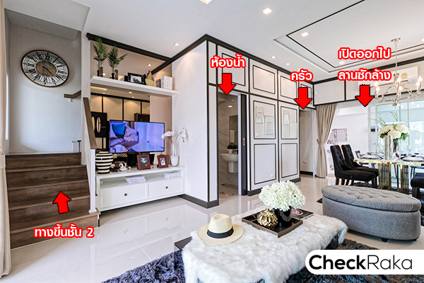 ฟังก์ชันบ้านชั้น 1 เริ่มจากฝั่งขวามือ เป็นบันไดทางขึ้นชั้น 2 จากนั้นเป็นห้องน้ำ ติดกับห้องน้ำ คือ ครัว