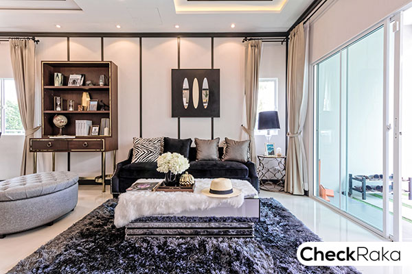 จัดวางโซฟารับแขกขนาด 3-4 ที่ได้พอดี สำหรับบ้านแปลงมุมบางหลังจะมีหน้าต่างบานกระทุ้ง