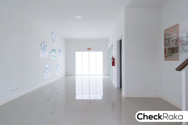 เล็กน้อยช่วงตรงกลางบ้าน มีความสูงจากพื้นถึงเพดาน 3 เมตร ส่วนสติ๊กเกอร์ที่เห็นติดตรงผนังเป็นคำอธิบายบ้านพฤกษา Fresh Air System เพื่อให้ทราบถึงข้อดี และการทำงานของระบบนี้ ซึ่งเป็นระบบที่นำมาใช้ในบ้านโครงการนี้ค่ะ