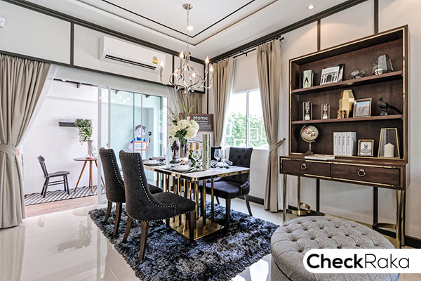 ตรงข้ามกับห้องอเนกประสงค์ มีพื้นที่สำหรับจัดวางโต๊ะรับประทานอาหาร สามารถวางโต๊ะได้ 4-6 ที่ พื้นที่ส่วนนี้