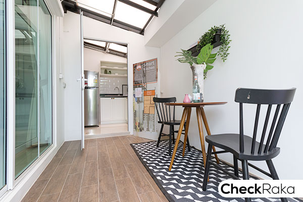 วางเก้าอี้นั่งแบบสบายๆ ไว้ สำหรับบ้านหลังมุมเจ้าของบ้านสามารถติดตั้งประตูเพื่อเปิดออกไปข้างบ้านได้ค่ะ