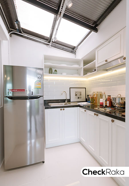 อีกครึ่งหนึ่งกั้นเป็นห้องครัวไทย ภายในตกแต่งเป็นเคาน์เตอร์ครัวแบบตัว L วางตู้เย็นได้พอดี