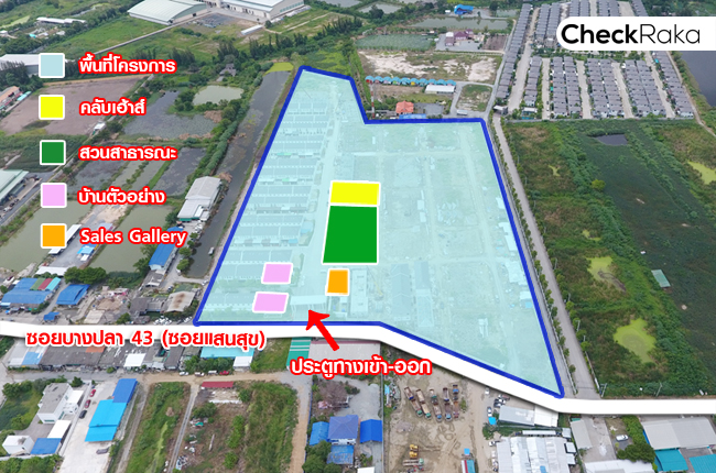 เข้าโครงการได้จากถนนบางนา-ตราด ตรงปากซอยบางปลา 43 (ซอยแสนสุข)