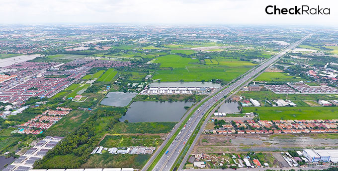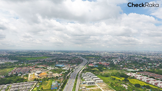 รามอินทราโซนถนนวงแหวนกาญจนาภิเษก มีพื้นที่พร้อมพัฒนาอีกเยอะเลยค่ะ สังเกตได้ชัดเลยว่าหมู่บ้านจัดสรรเกาะกลุ่มกันหลายโครงการ ด้านขวามือจะเห็นฝั่งเมืองอยู่ลิบๆ