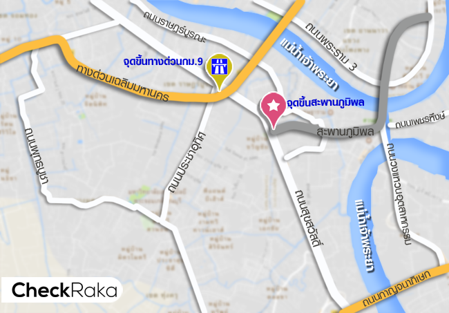 แผนที่แสดงจุดขึ้นทางด่วน กม.9 (ด่านสุขสวัสดิ์) และจุดขึ้นสะพานภูมิพลเพื่อเข้าสู่ใจกลางเมือง