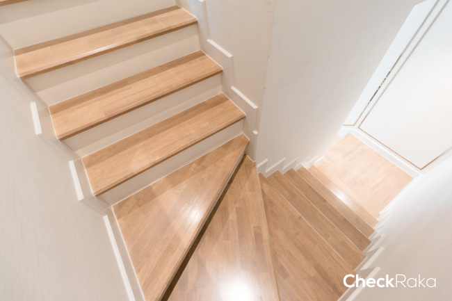 เรากำลังเดินทางขึ้นไปยังชั้น 2 ของบ้าน ด้วยบันไดที่มีชานพักเป็นรูปสามเหลี่ยม