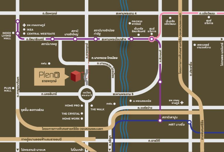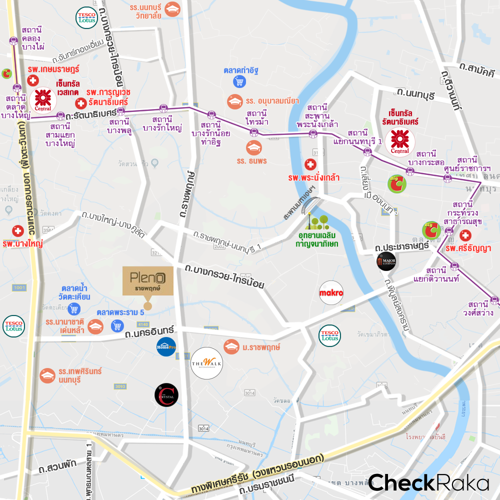 สำหรับโครงการ "พลีโน่ ราชพฤกษ์ (Pleno Ratchapruek)" ตั้งอยู่ในซอยบางกร่าง 45/4 ซึ่งห่างจากถนนราชพฤกษ์ประมาณ 1 กม. สามารถเดินทางหลักได้โดยใช้ถนนราชพฤกษ์ ซึ่งบนทำเลราชพฤกษ์นี้ ก็รายล้อมไปด้วยสิ่งอำนวยความสะดวกต่างๆ มากมาย และครอบคลุมในทุกด้าน อาทิ โรงพยาบาล, โรงเรียน, ห้างสรรพสินค้า, ตลาด และที่สำคัญ ยังสามารถเดินทางไปยังรถไฟฟ้าสายสีม่วงได้อย่างสะดวก โดยรถไฟฟ้าที่อยู่ใกล้กับโครงการคือ MRT สายสีม่วง สถานีบางรักใหญ่ ซึ่งสามารถใช้งานได้แล้วในปัจจุบัน