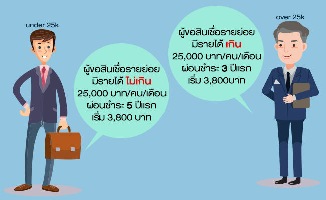 - ส่วนกรณีผู้ประกอบอาชีพประจำหรืออาชีพอิสระที่มีรายได้ไม่เกิน 25,000 บาท สามารถนำหลักฐานการชำระค่าเช่าบ้าน หรือ ผ่อนชำระเงินดาวน์บ้านไม่น้อยกว่า 12 เดือน มาประกอบการพิจารณา เพื่อคำนวณรายได้เพิ่มเติมได้