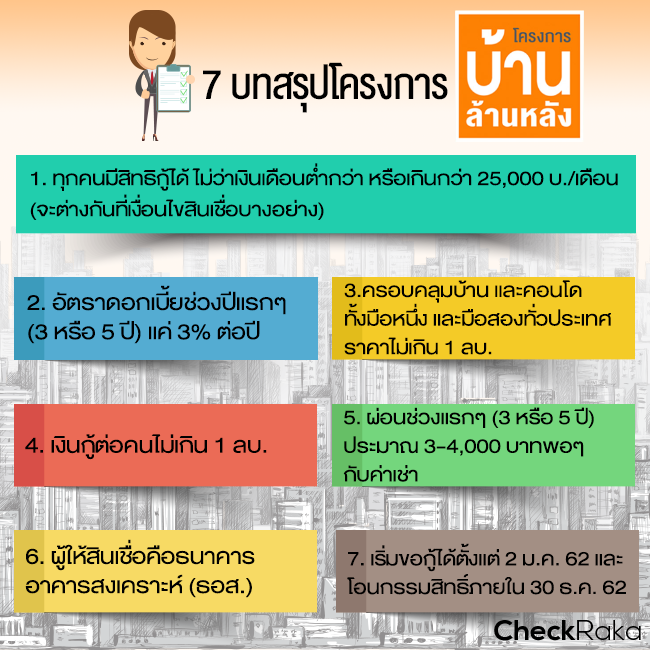 เมื่อวันที่ 20 พ.ย. 61 ที่ผ่านมา คณะรัฐมนตรีมีมติเห็นชอบให้กระทรวงการคลังดำเนินโครงการสินเชื่อเพื่อที่อยู่อาศัยแห่งรัฐ (โครงการ "บ้านล้านหลัง") เพื่อสนับสนุนให้ประชาชนมีที่อยู่อาศัยเป็นของตนเองในระดับราคาที่ไม่สูงนัก และเหมาะสมกับศักยภาพของประชาชนแต่ละกลุ่ม โดยเฉพาะกลุ่มผู้มีรายได้น้อยที่ไม่สามารถเข้าถึงสินเชื่อของธนาคารพาณิชย์ และกลุ่มคนวัยทำงานที่กำลังเริ่มต้นสร้างครอบครัว โดยการให้สินเชื่อจะเป็นการให้ผ่านธนาคารอาคารสงเคราะห์ (ธอส.) ถ้าเราสนใจสินเชื่อบ้านล้านหลังนี้ คำถามคือใครมีสิทธิบ้าง และต้องทำยังไงถ้าต้องการสินเชื่อนี้ วันนี้ Checkraka สรุปง่ายๆ ให้ดูกันครับ
