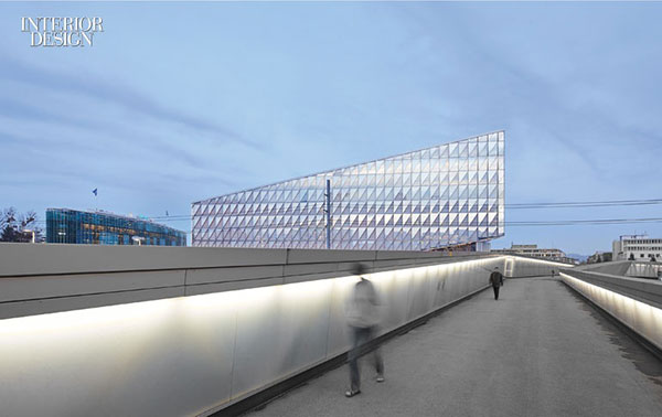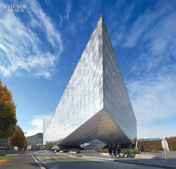 สำนักงานใหญ่ของ JT International ใน Geneva อาคารสามเหลี่ยมที่โดดเด่นด้วยการนำวัสดุอะลูมิเนียมเคลือบผิวมาเป็นองค์ประกอบของฟาซาด เพิ่มลูกเล่นให้อาคารเวลากระทบแสง