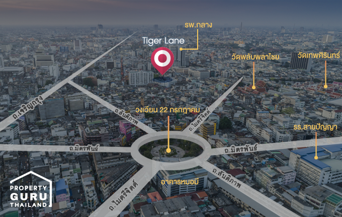 ทำเลใจกลาง China Town กับภาพมุมสูงบริเวณวงเวียน 22 กรกฎาคม ทางแยกสู่ถนน 5 สาย และมองเห็นที่ตั้งของ Tiger Lane