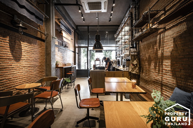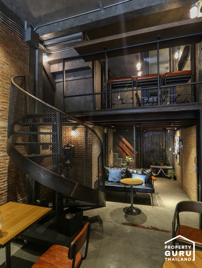 บรรยากาศภายในร้านสไตล์ลอฟท์ แต่งผนังด้วยอิฐ และปูนเปลือย แต่งด้วยเหล็กโทนสีดำเพิ่มความขลัง