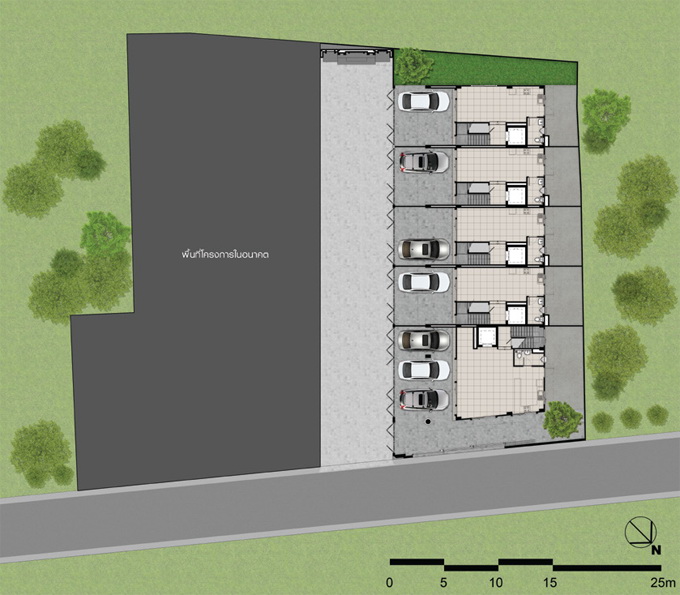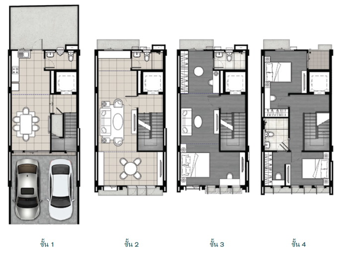- เนื้อที่บ้าน 24 - 50 ตร.ม. พื้นที่ใช้สอย 248 - 402 ตร.ม. หน้ากว้าง 5.5 - 12.3 เมตร
