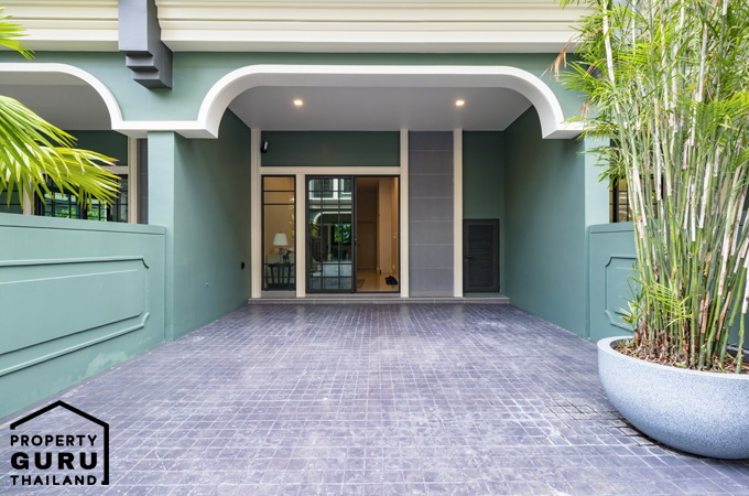 พื้นที่หน้าบ้านสามารถจอดรถได้ 2 คัน ประตูทางเข้าเป็นบานเลื่อน