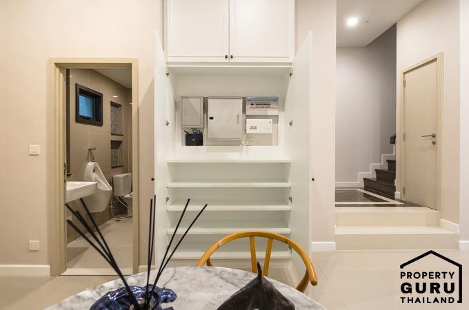 มีพื้นที่ชั้นวางของอยู่ใกล้ๆ กับห้องน้ำ และทำเป็นจุดควบคุมระบบไฟในบ้านได้
