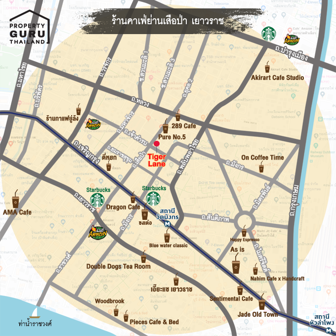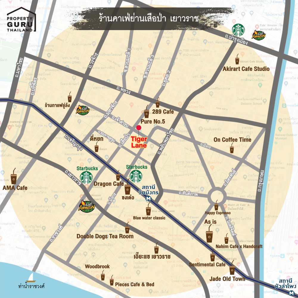 นอกจากนี้ ย่านเสือป่า-เยาวราช ยังได้ขึ้นชื่อว่าเป็นเมืองแห่งคาเฟ่หลากหลายสไตล์ มีทั้งสไตล์ไทย-จีน และนานาชาติ เยอะแยะไปหมด ถ้าหากแปลงกายเป็นนักท่องเที่ยวแล้วมาเดินเที่ยวในย่านนี้ คงจะต้องแวะร้านคาเฟ่แทบไม่หวาดไม่ไหวแน่ๆ ทางเราก็เลยทำแผนที่คร่าวๆ ของร้านคาเฟ่ที่อยู่ใกล้เคียงกับโครงการในระยะ 1 กม. มาให้ดูกันด้านล่างนี้ และเอาร้านคาเฟ่ที่น่าสนใจมาฝากกันด้วยค่ะ