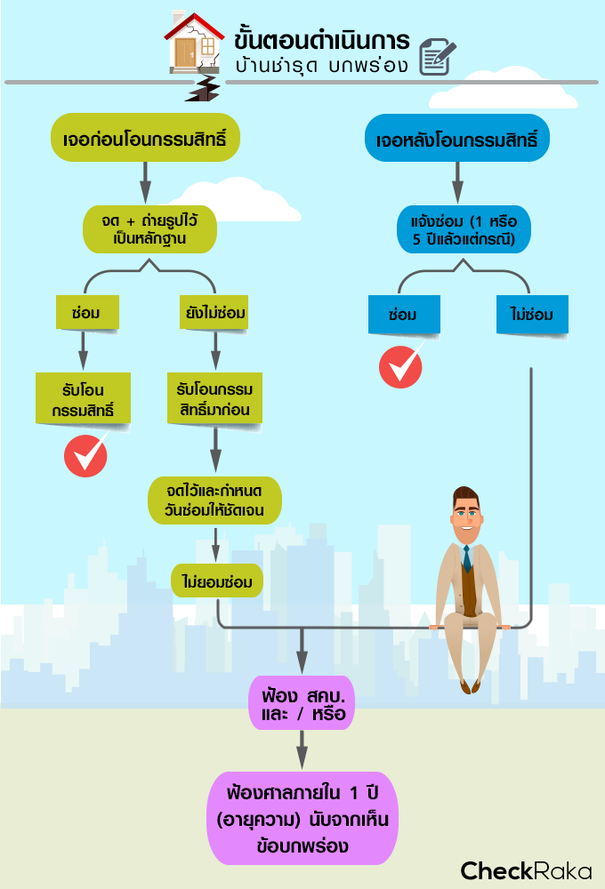 - ถ้าถึงขั้นจะต้องฟ้องผู้ประกอบการต่อศาล จะต้องฟ้องภายใน 1 ปี นับแต่วันที่ได้เห็นข้อบกพร่องนั้น