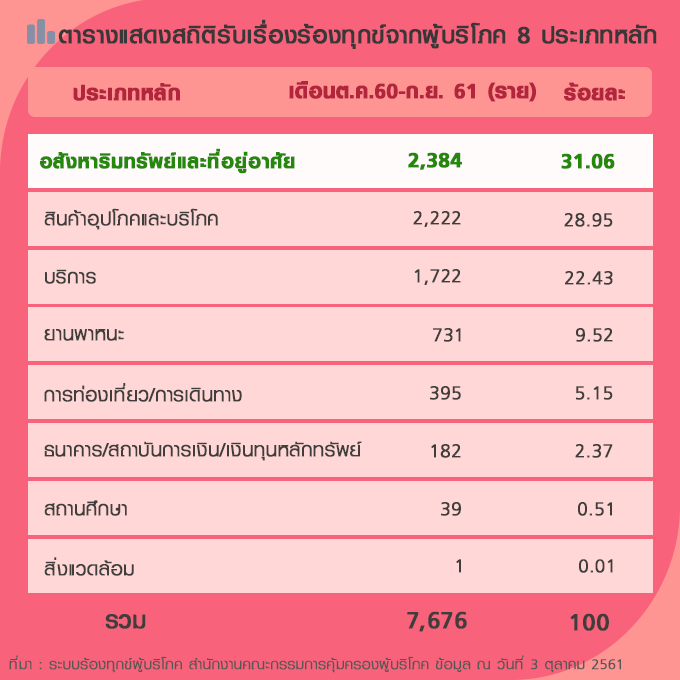 เมื่อเรามาดู สถิติรับเรื่องร้องทุกข์จากผู้บริโภคในระบบร้องทุกข์ผู้บริโภค จากสำนักงานคณะกรรมการคุ้มครองผู้บริโภค (สคบ.) จะเห็นว่าประเภทการร้องทุกข์ที่มาเป็นอันดับต้นๆ นั้นก็คือเรื่อง "อสังหาริมทรัพย์" นี่เองค่ะ โดยจากปีที่ผ่านมาช่วงเดือนตุลาคม 260 ถึง กันยายน 2561 มีอัตราส่วนในการร้องเรียนถึง 31.06% จากประเภทหลักทั้งหมด 8 ประเภท ดูได้จากตารางด้านล่างเลยค่ะ