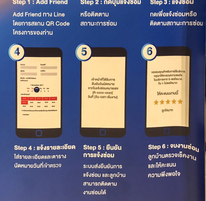สำหรับกรณีที่ต้องการแจ้งซ่อมกับทางโครงการ เรามีตัวอย่างขั้นตอนการแจ้งซ่อมแซมส่วนที่ชำรุดมาฝากกันด้วยค่ะ ซึ่งเดี๋ยวนี้บางโครงการก็ได้เพิ่มความสะดวกสบาย ด้วยการแจ้งผ่านแอปพลิเคชัน Line ได้เลย แถมยังแจ้งได้ตลอด 24 ชม. อีกด้วย
