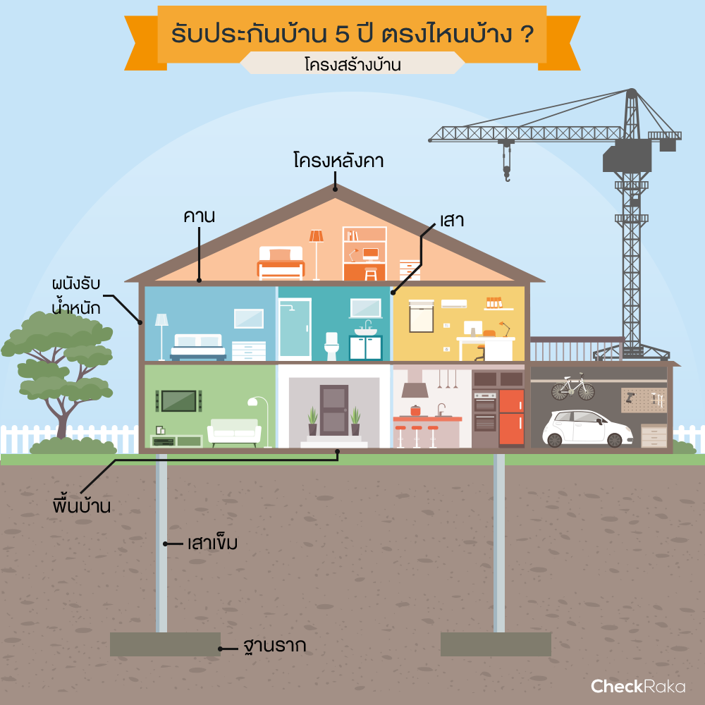 - 5 ปี สำหรับโครงสร้าง (Structural Defects) ตัวอย่างเช่น เสา คาน ฐานราก โครงหลังคา ผนังรับน้ำหนัก โดยจะต้องรับประกันให้ฟรี 5 ปี นับจากวันโอนกรรมสิทธิ์บ้าน