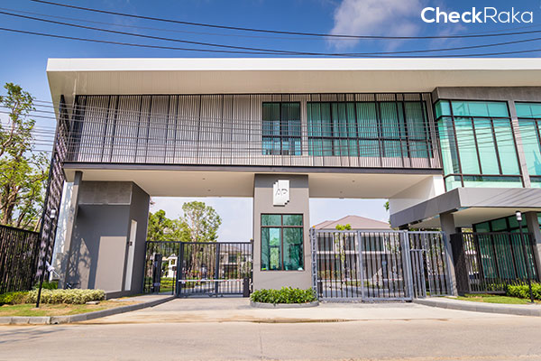 ซุ้มโครงการกว้างขวาง แยกช่องทางเข้า-ออกชัดเจน พร้อมด้วยช่องประตูเล็กสำหรับเดินเท้า
