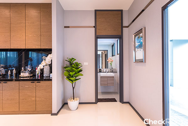 มุมมองจากห้องนั่งเล่น จากซ้ายมือจะเป็นห้องครัว, โต๊ะทานข้าว, ห้องน้ำ, ประตูไปลานจอดรถ, ประตูหน้าบ้าน, ห้องมิเตอร์ไฟฟ้า และบันไดขึ้นชั้น 2 ตามลำดับ