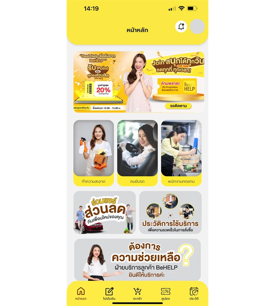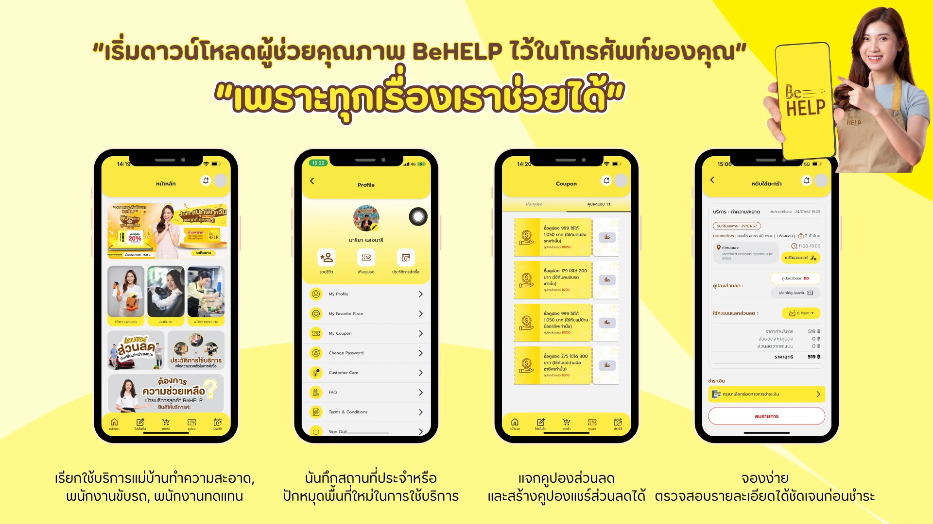 เริ่มต้นกันที่ แอปฯ BeHELP เป็นแอปที่รวมบริการไว้ 3 รูปแบบ คือ บริการแม่บ้านทำความสะอาด,พนักงานขับรถ, พนักงานทดแทน
