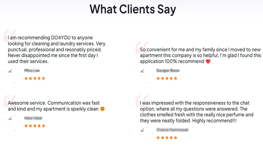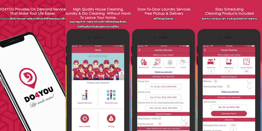 อีกแอปฯ ทำความสะอาดบ้านที่น่าสนใจ Do4you มีบริการทั้งในด้านการทำความสะอาด, บริการซัก อบ รีด, และ ซักแห้ง ในส่วนของการเรียกแม่บ้านทำความสะอาดของแอปฯ นี้จะเริ่มต้นที่ 250 บาท ต่อ 1 ชั่วโมง ต่อแม่บ้าน 1 คน แต่มีเงื่อนไขคือ ต้องมีออร์เดอร์ขั้นต่ำ 550 บาท ซึ่งจะยังไม่รวมภาษีอีก 7% แต่จะรวมค่าอุปกรณ์ทำความสะอาดแล้วค่ะ