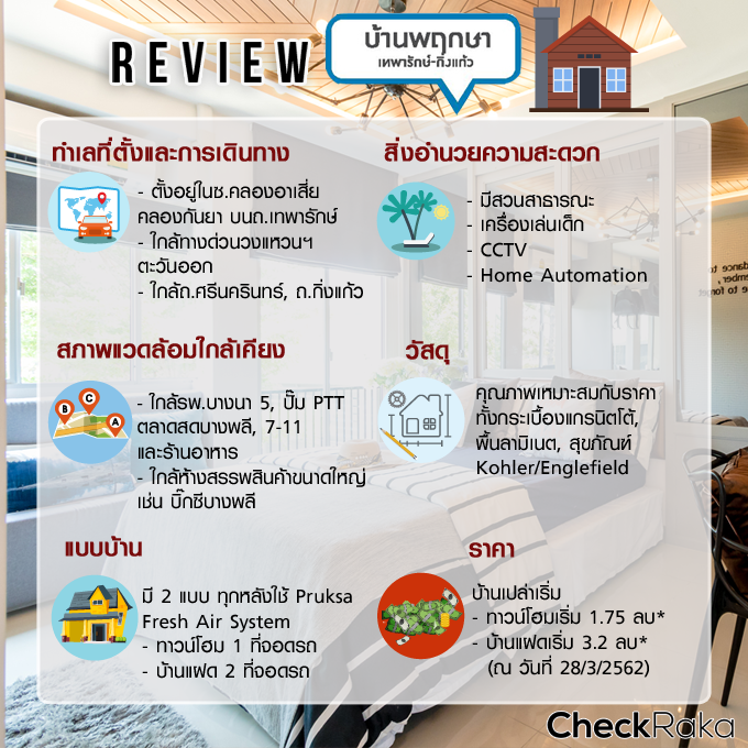 โครงการ "บ้านพฤกษา เทพารักษ์ - กิ่งแก้ว (Baan Pruksa Theparak - Kingkaew)" ทาวน์โฮม 2 ชั้น เปิดพรีเซลไปเมื่อปลายปี 2560 ปัจจุบันการก่อสร้างบ้านและการเปิดขาย จะเป็นลักษณะการสร้างบ้านเริ่มจากตอนต้นโครงการ มีทั้งส่วนที่สร้างเสร็จพร้อมโอน และยังสร้างไม่เสร็จ ส่วนการเปิดขายนั้นเปิดขายทีละเฟส เปิดช่วงต้นโครงการโซนใกล้สวนก่อน ซึ่งในปัจจุบัน มีลูกค้าสนใจจองบ้านไปประมาณ 100 หลัง จากจำนวนบ้านทั้งหมด 459 หลัง คิดเป็นประมาณ 20% สำหรับบ้านที่เปิดขายเป็นบ้านเปล่า ไม่รวมตกแต่งเฟอร์นิเจอร์ หากใครที่กำลังสนใจและมองหาบ้านในทำเลนี้อยู่ ลองแวะไปชมบ้านจริงได้ที่สำนักงานขาย เปิดทุกวัน 9.00-18.00 น. ค่ะ