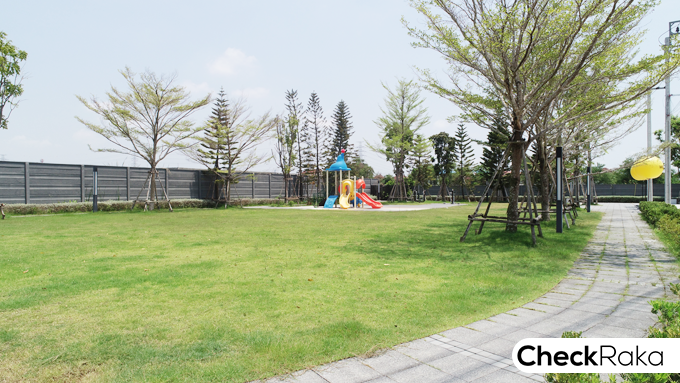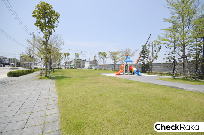 บริเวณสวนสาธารณะของโครงการ ปูหญ้า ลงไม้ใหญ่ไม้พุ่มไว้ให้