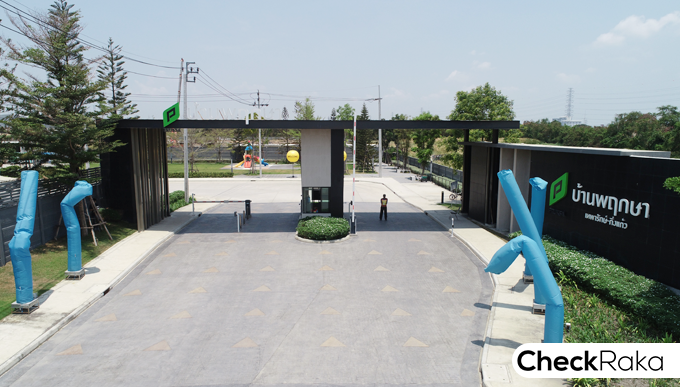 ฝั่งขวามือมีป้ายชื่อโครงการ บ้านพฤกษา เทพารักษ์ - กิ่งแก้ว