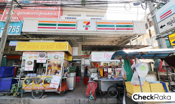 7-11 อยู่ก่อนถึงซอยทางเข้าไม่ไกล ตรงหน้าถนนเทพารักษ์มีร้านอาหารของกินหลากหลาย