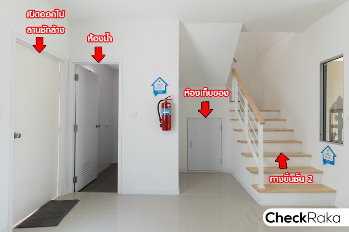 ฟังก์ชันบ้านชั้น 1 เริ่มจากฝั่งขวามือ เป็นบันไดทางขึ้นชั้น 2 จากนั้นเป็นห้องเก็บของใต้บันได ถัดมาเป็นพื้นที่ของห้องน้ำ และด้านหลังสุดจะมีประตูเปิดออกไปลานซักล้างหลังบ้านค่ะ
