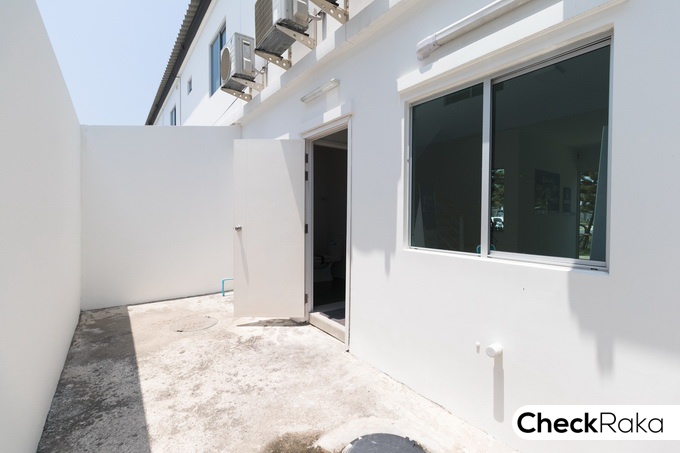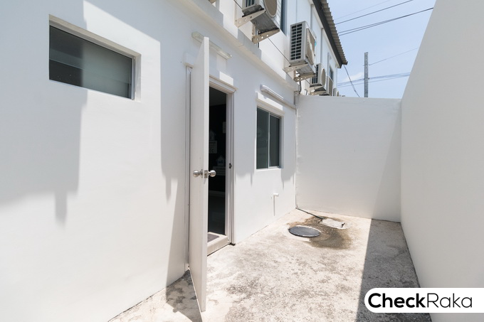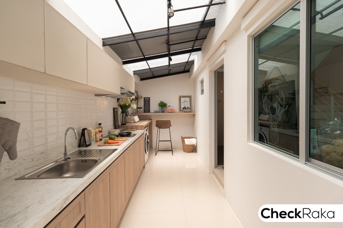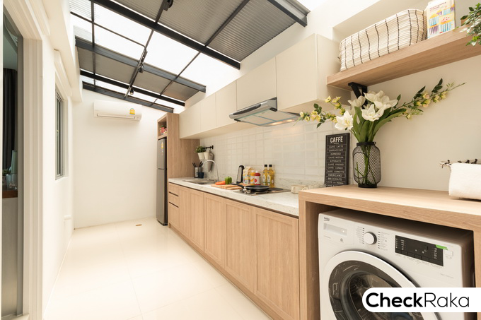 ลานซักล้างหลังบ้านสำหรับบ้านตัวอย่างนี้ ทางโครงการตกแต่งให้เป็นครัวแยกส่วน ติดตั้งเคาน์เตอร์ครัว และมุงหลังคาไว้ให้ดูเป็นตัวอย่าง ซึ่งท่านเจ้าของบ้านสามารถปรับพื้นที่ส่วนนี้ได้ตามใจชอบ