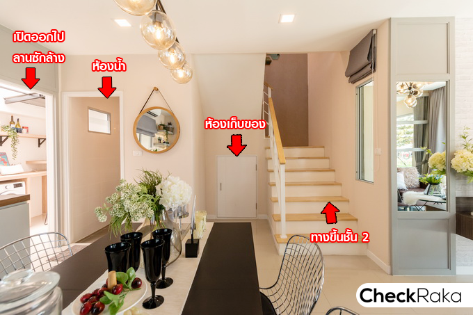 ฟังก์ชันบ้านชั้น 1 เรียงกันตามรูป เริ่มจากฝั่งขวามือ เป็นบันไดทางขึ้นไปชั้น 2 จากนั้นเป็นห้องเก็บของใต้บันได ถัดมาเป็นห้องน้ำ และด้านหลังสุดจะมีประตูเปิดออกไปลานซักล้างหลังบ้าน