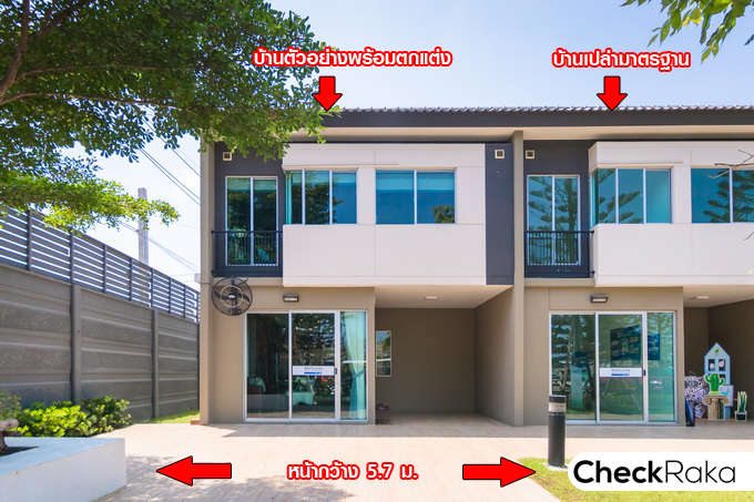 พามาชมบ้านตัวอย่างพร้อมตกแต่งกันก่อนนะคะ บ้านแบบนี้มีหน้ากว้าง 5.7 เมตร สามารถจอดรถได้ 1 คัน