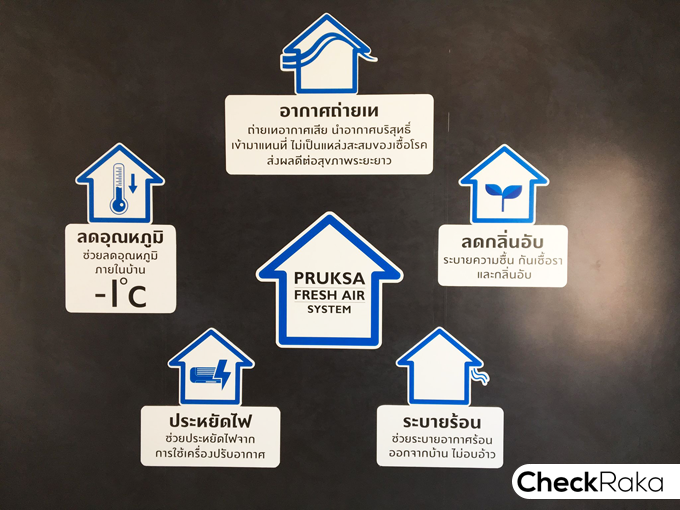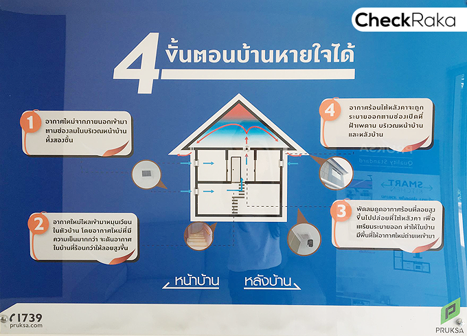 พื้นชั้นล่างปูด้วยกระเบื้องแกรนิตโต้ 60 x 60 ซม. ไฟด้านล่างเป็นโคมไฟ LED Downlight ฝ้าที่ให้เป็นฝ้าเรียบ สติ๊กเกอร์ที่เห็นติดตรงผนังเป็นคำอธิบายบ้านพฤกษา Fresh Air System เพื่อให้ทราบถึงข้อดี และการทำงานของระบบนี้