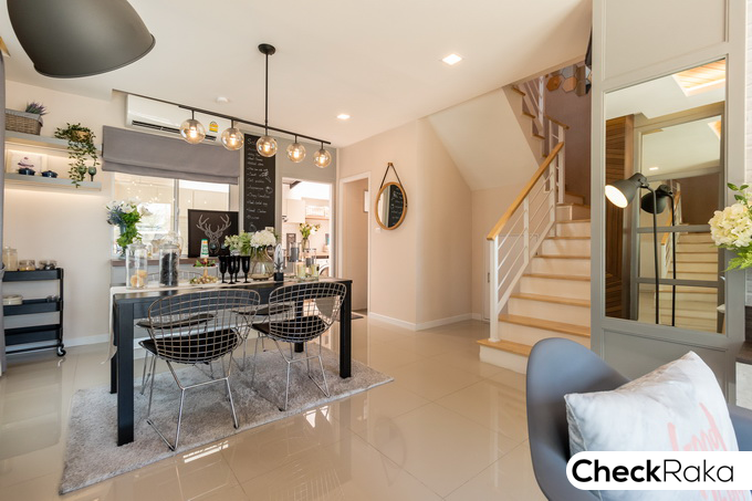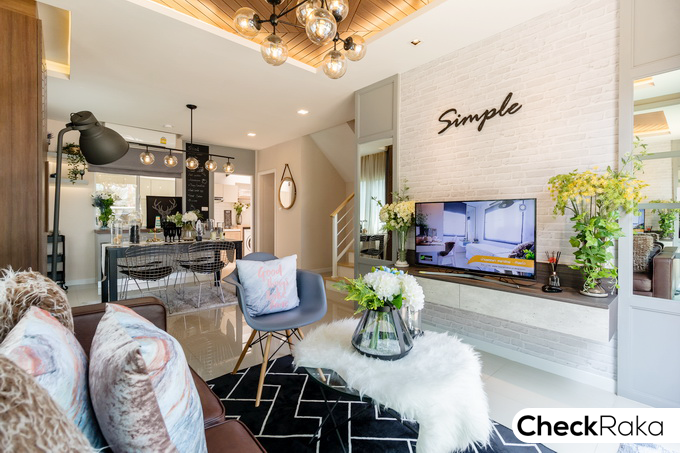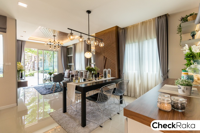 บ้านตัวอย่างอยู่ติดกับสำนักงานขาย เป็นทาวน์โฮมบล็อคเดียวกัน ออกแบบสไตล์สแกนดิเนเวีย สีโทนเข้ม