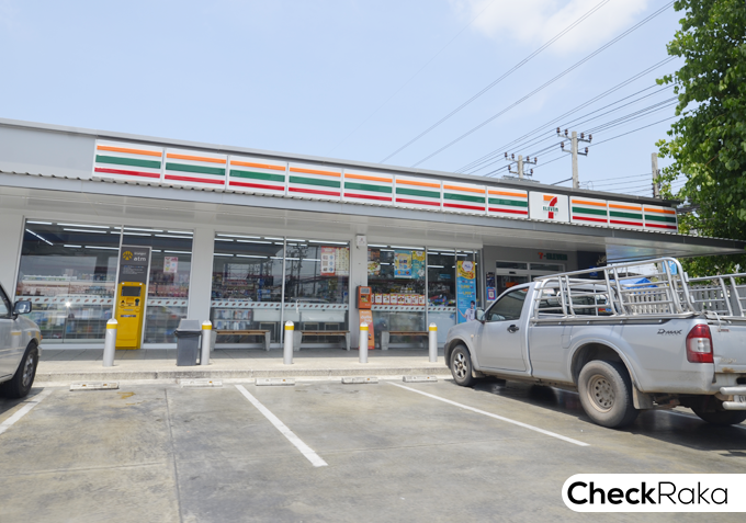 7-11 อยู่ก่อนถึงซอยทางเข้าไม่ไกล ตรงหน้าถนนเทพารักษ์มีร้านอาหารของกินหลากหลาย