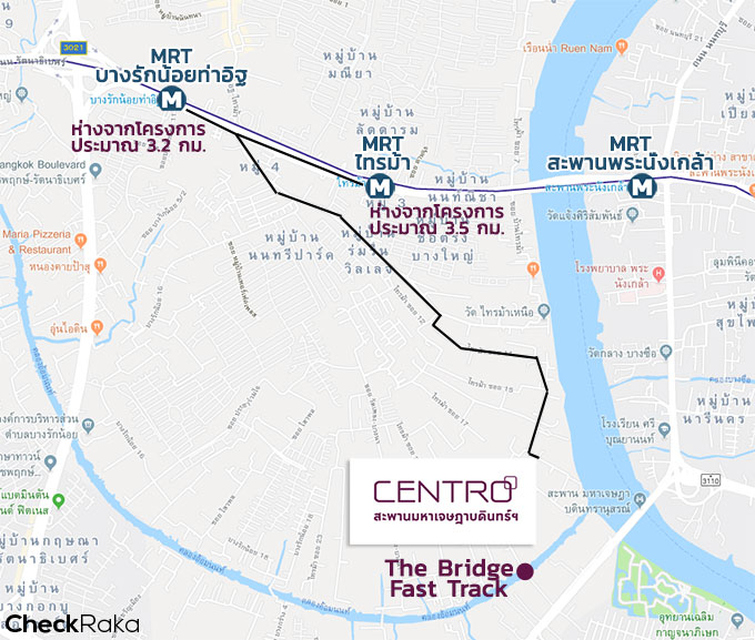 จริงๆ แล้วโครงการอยู่ระหว่าง MRT สายสีม่วง 2 โครงการด้วยกัน คือ สถานีบางรักน้อยท่าอิฐ (ประมาณ 3.2 กม.) และสถานีไทรม้า (ประมาณ 3.5 กม.)