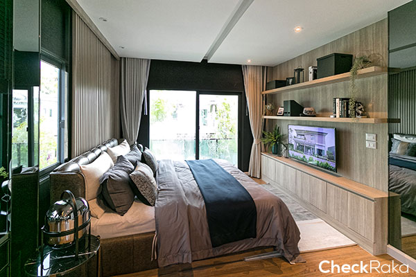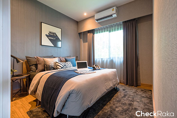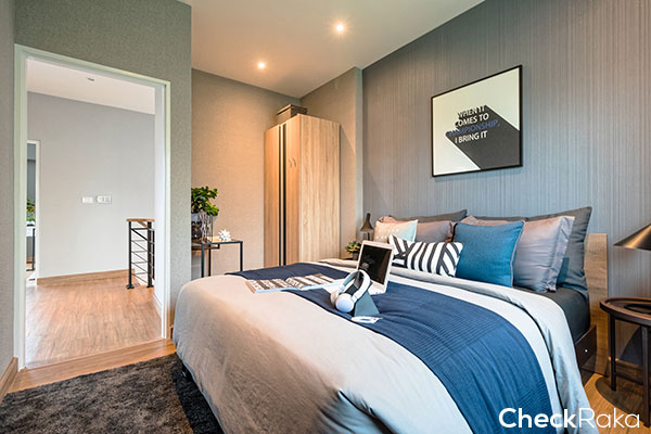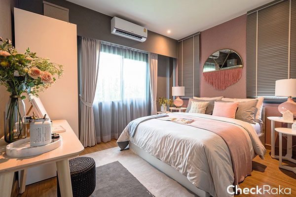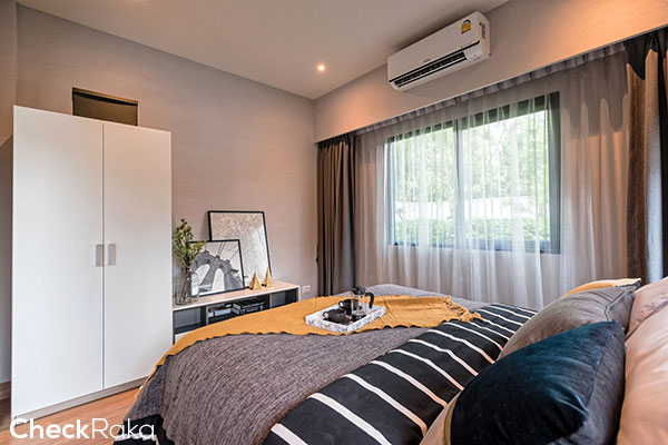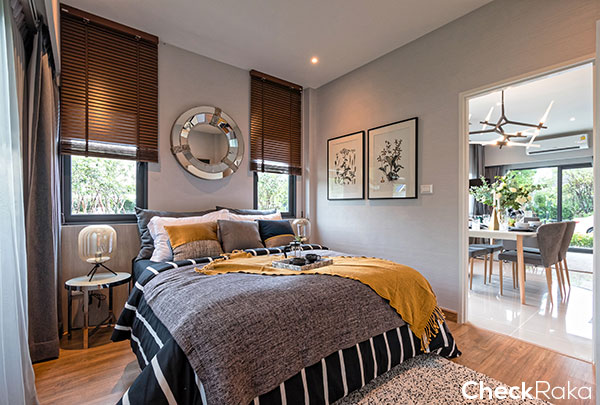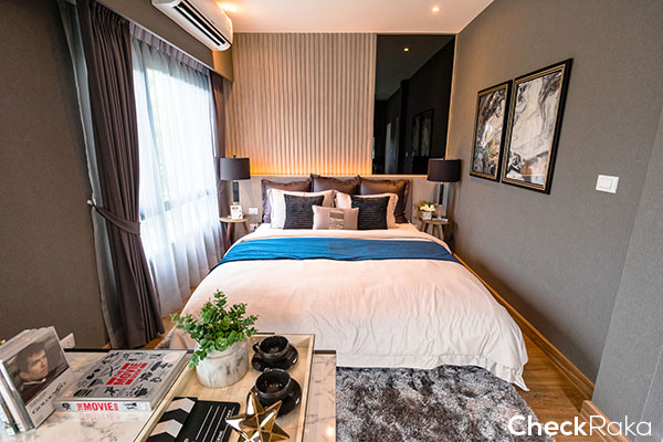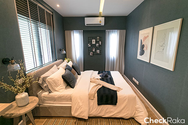 บ้านตัวอย่างออกแบบเป็นห้องนอน พอวางเตียงนอนแล้ว ก็มีพื้นที่เหลือๆ สำหรับตู้เสื้อผ้าได้สบายๆ