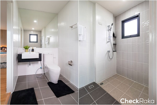 ห้องน้ำจะแชร์กันระหว่างห้องนอน 2 และห้องนอน 3 มีสุขภัณฑ์ครบครัน