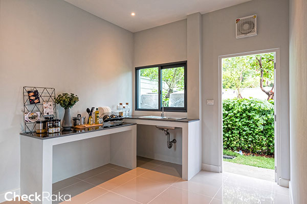 ตัวอย่างเคาร์เตอร์ครัว เป็นไอเดียในการแต่งบ้านได้ ขวามือเป็นประตูออกไปลานซักล้าง