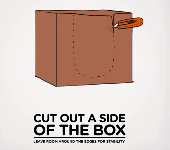 พอได้กล่องมา เราก็ตัดกล่องด้านนึงออก เพื่อให้เป็นทางเข้า-ออก ของเจ้านายเรา อาจจะไม่ต้องเป็นรูปทรงตามนั้นเป๊ะๆ ก็ได้ค่ะ