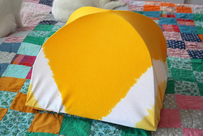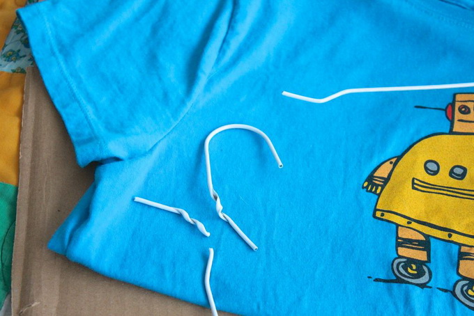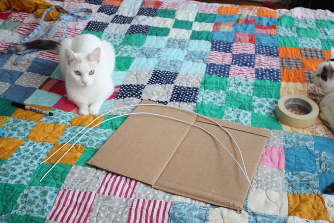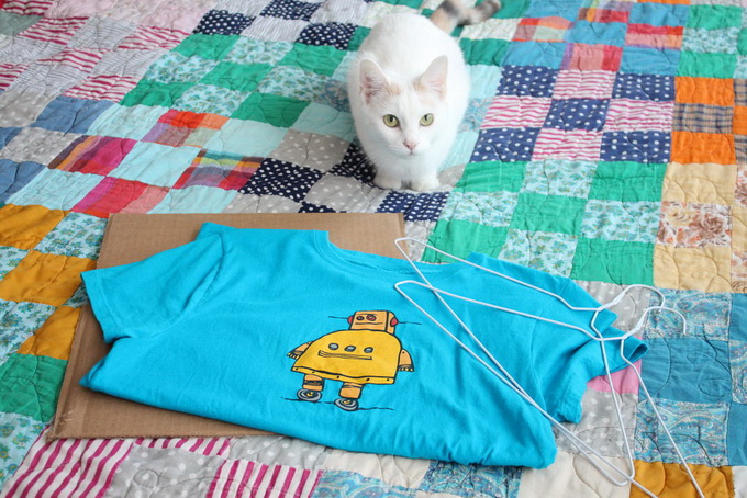 อุปกรณ์ที่ใช้ เสื้อยืดเก่าๆ ตัวใหญ่ๆ แผ่นกระดาษจากกระดาษลังตัดเป็นรูปสี่เหลี่ยมจัตุรัส ขนาด 15x15 นิ้ว หรือใหญ่กว่านี้ก็ได้ ตามขนาดเสื้อและเจ้านายของเรา ไม้แขวนเสื้อ 2 อัน และแมว 1 ตัว (555)