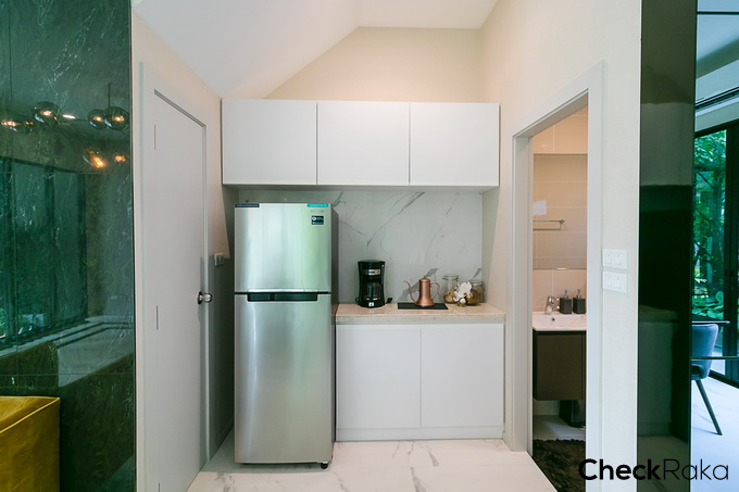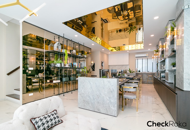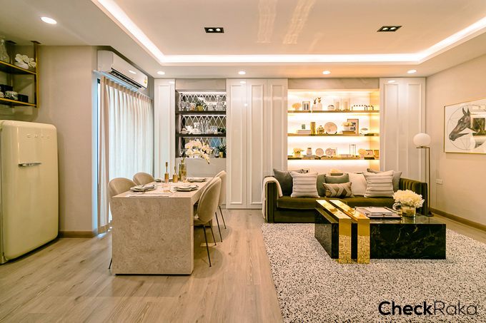 วางโซฟาขนาด 3-4 ที่ วางโต๊ะรับประทานอาหาร ติดตั้ง Pantry และตู้เย็น