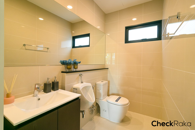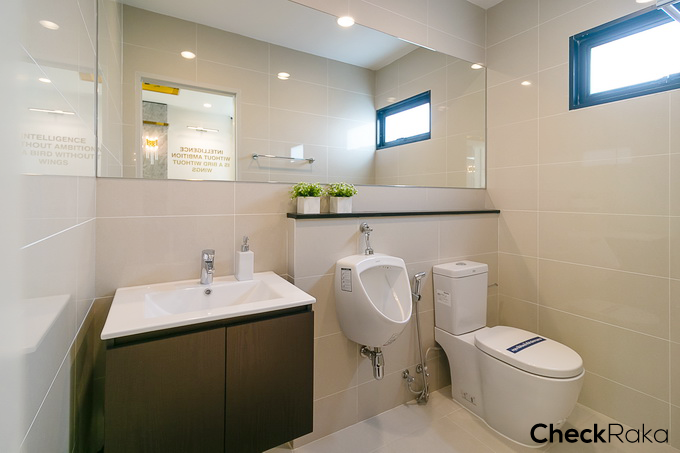 ห้องน้ำชั้น 1 ให้สุขภัณฑ์มาครบ มีอ่างล้างมือ ก๊อกน้ำ โถสุขภัณฑ์สำหรับผู้ชาย/โถสุขภัณฑ์ปกติ ของ American Standard และมีบานกระทุ้งระบายอากาศ 1 บาน